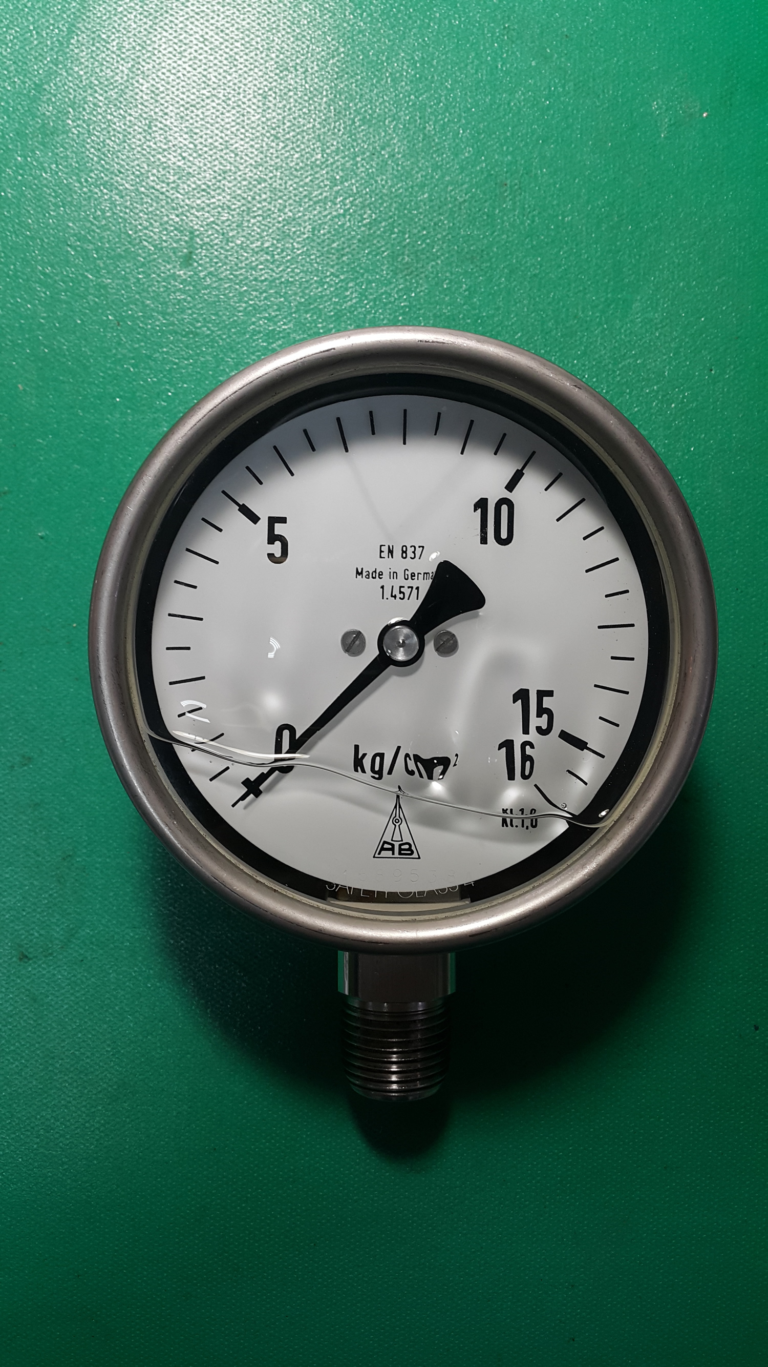 展示品 不繡鋼德制壓力計16kg/cm 4"錶面 無背緣 直立充油 1/2"PT牙